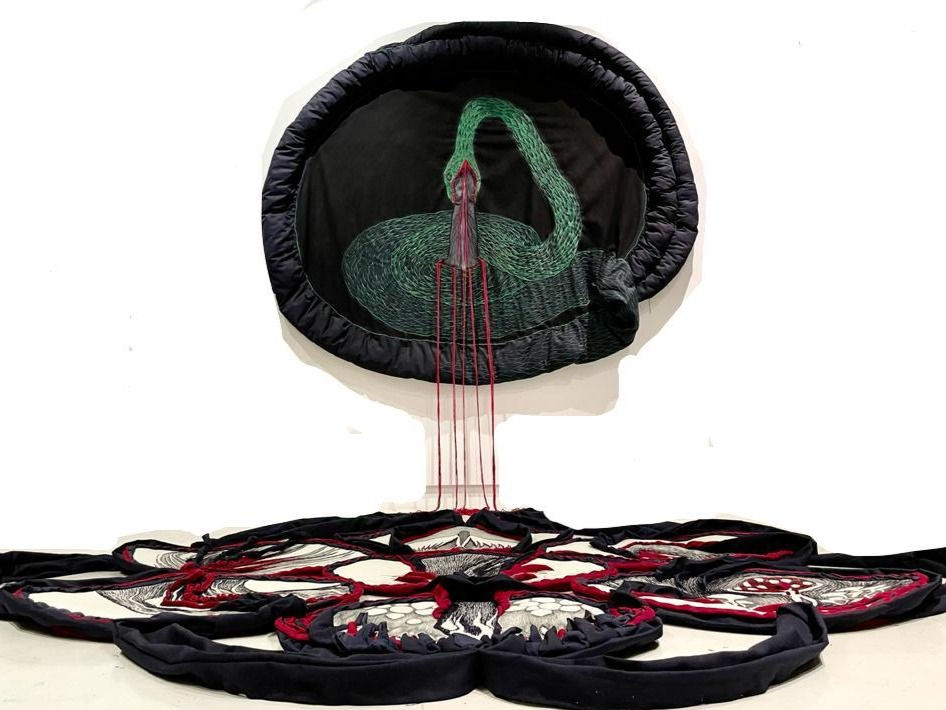 Dark cotton fabric, background painted with charcoal, drawing in gray and dry pastel, thread embroidery and filling with recycled fabric scraps.